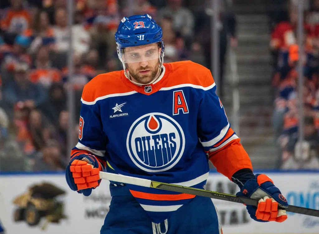 EDMONTON, CANADA – MARCH 29: Leon Draisaitl #29 of the Edmonton Oilers looks on during a stoppage in play during the game against the Calgary Flames at Rogers Place on March 29, 2025, in Edmonton, Alberta, Canada. (Photo by Leila Devlin/Getty Images)