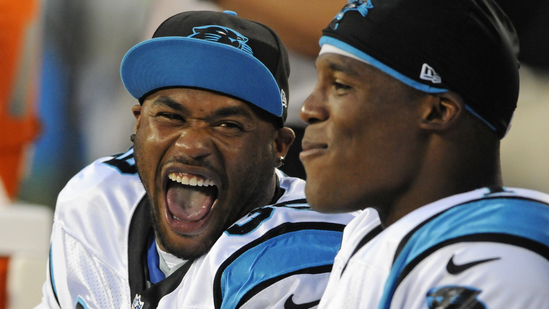 FILE – Carolina Panthers’ Steve Smith, left, and Cam Newton, right, share a laugh during the first half of an NFL preseason football game against the Pittsburgh Steelers, Thursday, Aug. 29, 2013, in Charlotte, N.C. (AP Photo/Mike McCarn, File)(AP)